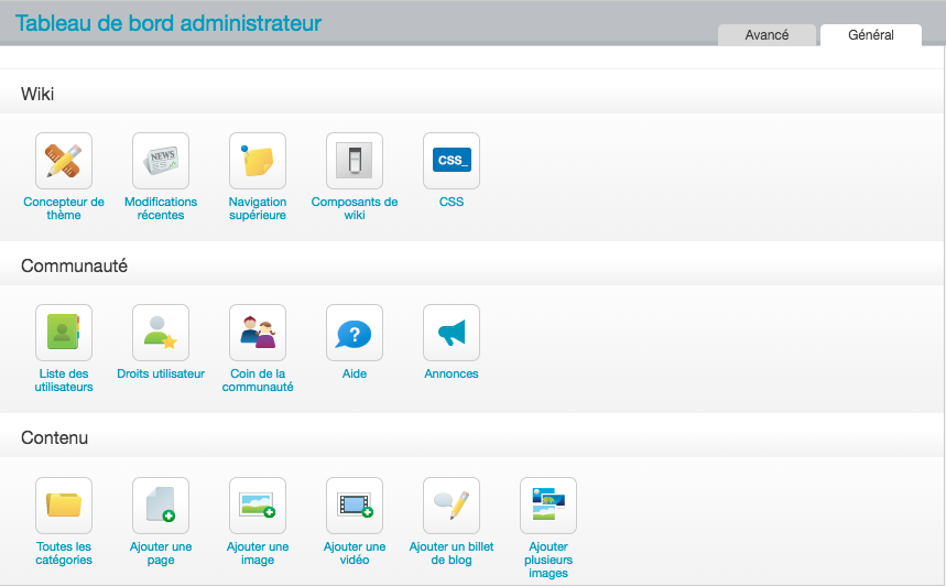 Si vous consultez un wiki sur lequel vous n'êtes pas administrateur, vous verrez cette page avec l'ancienne présentation.